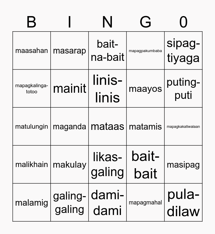 This bingo card has a free space and 40 words: Free!, maganda, mabait, matamis, malinis, malamig, mainit, malawak, maayos, masipag, matulungin, masarap, mapagmahal, mapagkakatiwalaan, malikhain, makulay, mapagbigay, mapagpakumbaba, mapanagot, maasahan, galing-galing, linis-linis, bait-bait, puting-puti, ganda-ganda, sipag-sipag, dami-dami, saya-saya, bilis-bilis, buong-puso, malamig-init, bait-na-bait, lakad-takbo, pula-dilaw, mapagkalinga-totoo, taas-baba, likas-galing, araw-gabi, sipag-tiyaga and likas-yaman.
