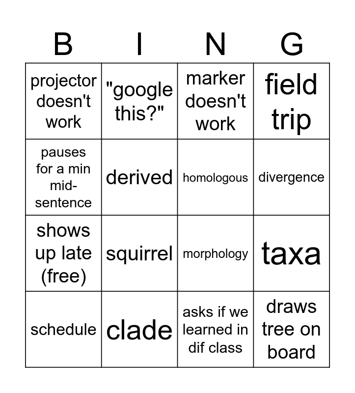 This bingo card has 16 words: clade, taxa, marker doesn't work, projector doesn't work, shows up late (free), "google this?", morphology, asks if we learned in dif class, pauses for a min mid-sentence, derived, schedule, field trip, squirrel, divergence, homologous and draws tree on board.