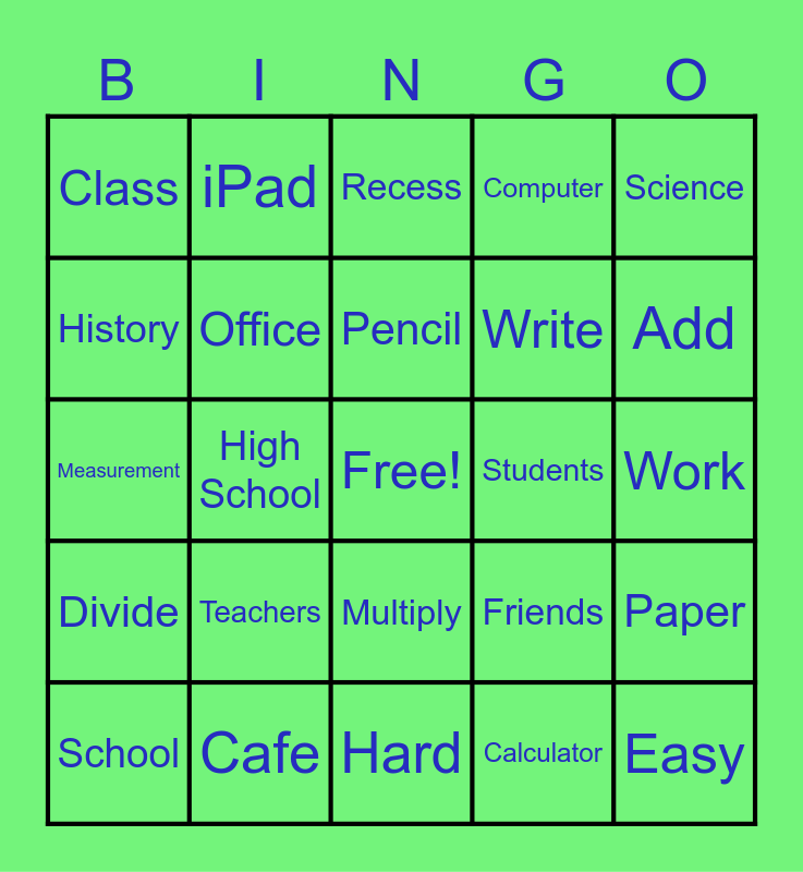 This bingo card has a free space and 29 words: School, Middle, High School, College, Class, Recess, Office, Teachers, Students, Cafe, Work, Easy, Hard, Calculator, Add, Lunch, Multiply, Divide, Science, Measurement, Friends, Read, Write, History, Computer, iPad, Paper, Pencil and Easy.