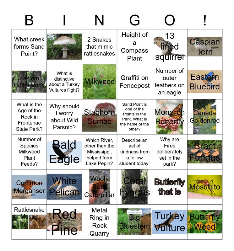 This bingo card has 21 images and 35 words: Number of Species Milkweed Plant Feeds?, Bald Eagle, Metal Ring in Rock Quarry, Graffiti on Fencepost, Monarch Butterfly, Canada Goldenrod, What creek forms Sand Point?, Red Pine, 2 Snakes that mimic rattlesnakes, Coral Fyngus, Number of outer feathers on an eagle, Caspian Tern, Common Merganser, Why should I worry about Wild Parsnip?, Milkweed, Height of a Compass Plant, Butterfly that is, Bract Fungus, Eastern Cottonwood, What is distinctive about a Turkey Vultures flight?, Which River, other than the Mississippi, helped form Lake Pepin?, Describe an act of kindness from a fellow student today:, Why are Fires deliberately set in the park?, Mosquito, What is the Age of the Rock in Frontenac State Park?, Staghorn Sumac, Big Bluestem, 13 lined squirrel, Eastern Bluebird, Rattlesnake Master, White Pelican, Wooly Bear Caterpillar, Sand Point is one of the Points in the Park. What is the name of the other?, Turkey Vulture and Butterfly Weed.