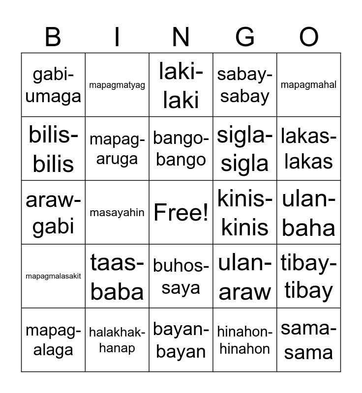 This bingo card has a free space and 33 words: mahinhin, matatag, masayahin, mapangahas, mapagmalasakit, mapag-aruga, mapagmahal, mapag-alaga, mapagmatyag, mapanghikayat, bango-bango, laki-laki, gulo-gulo, liit-liit, kinis-kinis, lakas-lakas, halakhak-hanap, araw-gabi, taas-baba, ulan-araw, buhos-saya, init-lamig, gabi-umaga, ulan-baha, bayan-bayan, sama-sama, sabay-sabay, sigla-sigla, bilis-bilis, tibay-tibay, lambing-lambing, hinahon-hinahon and giliw-giliw.