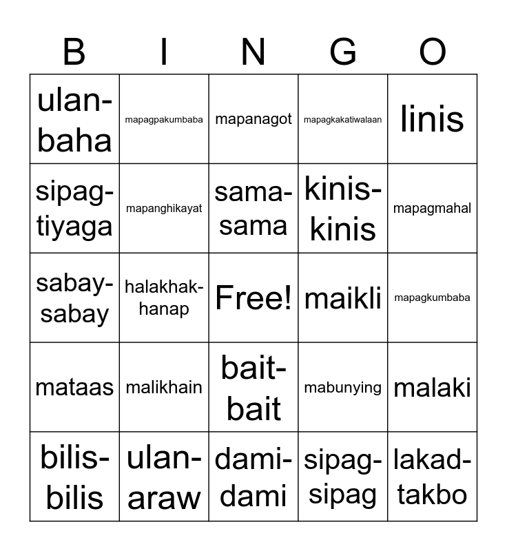 This bingo card has a free space and 101 words: ganda, bango, linis, bait, laki, liit, tamis, sarap, taas, lakas, init, lamig, lapadmalinis, maganda, mabait, matamis, mataas, malamig, mainit, malawak, masarap, maayos, masipag, matulungin, makulay, mapagmahal, mapagkakatiwalaan, malikhain, maasahan, mapagbigay, mapagpakumbaba, mapanagot, puting-puti, galing-galing, linis-linis, bait-bait, saya-saya, ganda-ganda, sipag-sipag, dami-dami, bait-na-bait, bilis-bilis, buong-puso, malamig-init, taas-baba, lakad-takbo, pula-dilaw, mapagkalinga-totoo, likas-yaman, likas-galing, araw-gabi, sipag-tiyaga, mahinhin, matatag, masayahin, mapangahas, mapagmalasakit, mapag-aruga, mapag-alaga, mapagmatyag, mapanghikayat, bango-bango, laki-laki, gulo-gulo, liit-liit, kinis-kinis, lakas-lakas, halakhak-hanap, ulan-araw, buhos-saya, init-lamig, gabi-umaga, ulan-baha, bayan-bayan, sama-sama, sabay-sabay, sigla-sigla, tibay-tibay, lambing-lambing, hinahon-hinahon, giliw-giliw, mahaba, maikli, mabango, mapangarapin, mapag-isip, mapagkumbaba, makintab, makulay-kulay, maginoo, mabunying, mahinahon, masigasig, maaliwalas, maliit, malaki, matalino, mapag-aral, mapagsikap, mapagsubok and bukas-sara.