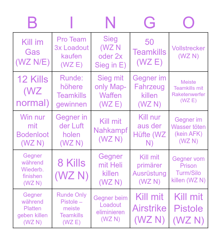 This bingo card has 25 words: 8 Kills (WZ N), Gegner beim Loadout eliminieren (WZ N), Sieg mit only Map-Waffen (WZ E), Gegner während Platten geben killen (WZ N), Vollstrecker (WZ N), Kill im Gas (WZ N/E), 12 Kills (WZ normal), Pro Team 3x Loadout kaufen (WZ E), Kill nur aus der Hüfte (WZ N), Gegner mit Heli killen (WZ N), Gegner im Fahrzeug killen (WZ N), Win nur mit Bodenloot (WZ N), Kill mit primärer Ausrüstung (WZ N), Gegner vom Prison Turm/Silo killen (WZ N), Runde: höhere Teamkills gewinnen, Kill mit Pistole (WZ N), Gegner im Wasser töten (kein AFK) (WZ N), Sieg (WZ N oder 2x Sieg in E), Meiste Teamkills mit Raketenwerfer (WZ E), Gegner in der Luft holen (WZ N), Kill mit Nahkampf (WZ N), Runde Only Pistole – meiste Teamkills (WZ E), Gegner während Wiederb. finishen (WZ N), 50 Teamkills (WZ E) and Kill mit Airstrike (WZ N).