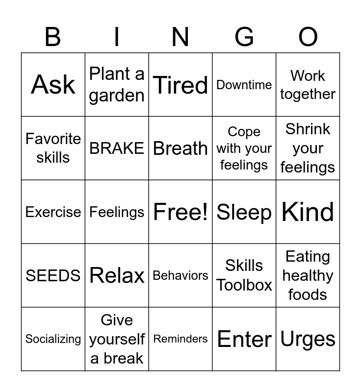 This bingo card has a free space and 27 words: Skills Toolbox, Manage your feelings, Cope with your feelings, Reminders, Favorite skills, Tired, Plant a garden, SEEDS, Sleep, Eating healthy foods, Exercise, Downtime, Socializing, Give yourself a break, Shrink your feelings, Deep Breaths, BRAKE, Breath, Relax, Ask, Kind, Enter, Feelings, Urges, Behaviors, Work together and When your brain overheats.