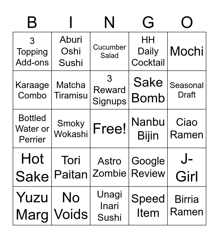 This bingo card has a free space and 24 words: Tori Paitan, No Voids, 3 Reward Signups, Yuzu Marg, Mochi, 3 Topping Add-ons, Karaage Combo, Aburi Oshi Sushi, Nanbu Bijin, Astro Zombie, Sake Bomb, Bottled Water or Perrier, Google Review, J-Girl, Matcha Tiramisu, Speed Item, Ciao Ramen, Cucumber Salad, Seasonal Draft, Smoky Wokashi, Birria Ramen, Hot Sake, HH Daily Cocktail and Unagi Inari Sushi.
