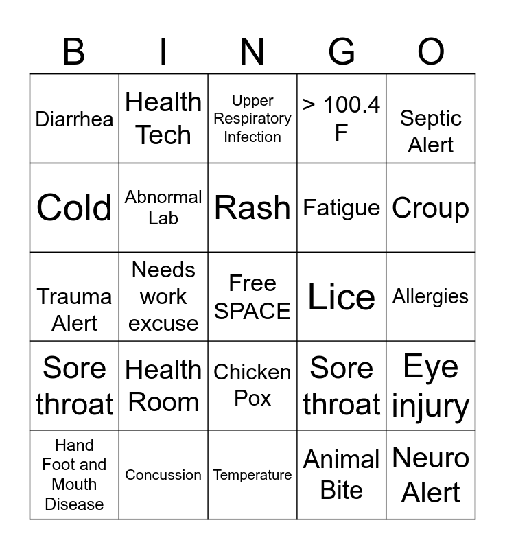 This bingo card has a free space and 35 words: Ankle injury, cough, STEMI, Abnormal Lab, Chicken Pox, > 100.4 F, Cold, Medication Refill, Rash, Contagious, Trauma Alert, Septic Alert, Fever-free, Vomiting, Diarrhea, Lice, Animal Bite, Needs work excuse, Sore throat, Neuro Alert, Sore throat, Hand Foot and Mouth Disease, Eye injury, Concussion, Upper Respiratory Infection, Croup, Stomach ache, Fussy, Fatigue, Allergies, Congestion, Temperature, Health Room, Health Tech and Parent Notification.