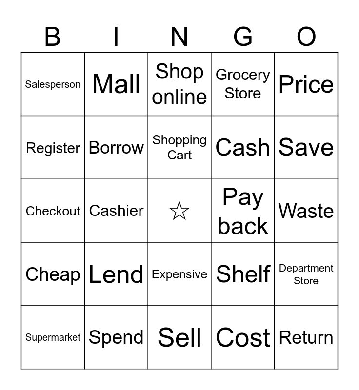 This bingo card has a free space and 29 words: Supermarket, Discount, Cashier, Clients, Salesperson, Shop online, Borrow, Lend, Pay back, Spend, Waste, Return, Sell, Cost, Save, Buy, Expensive, Cheap, Price, Checkout, Shelf, Isle, Cash, Register, Grocery Store, Mall, Department Store, Shopping Cart and Card.