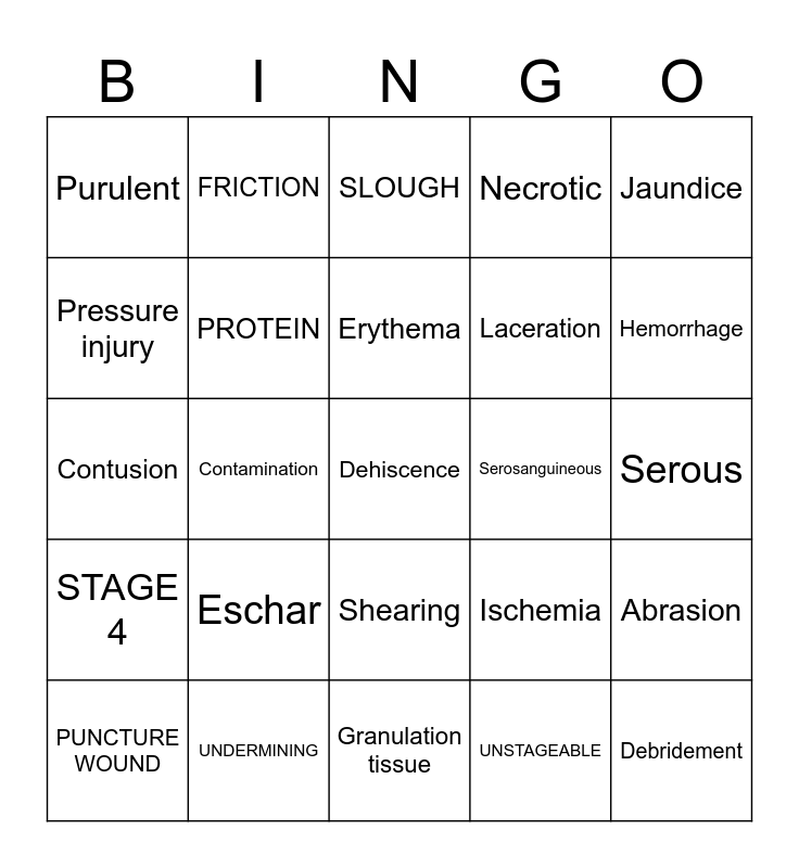 This bingo card has a free space and 39 words: Evisceration, COLONIZED, CONTUSIONS, PROTEIN, PUNCTURE WOUND, Shearing, Erythema, Pallor, Jaundice, STAGE 4, Contamination, Necrotic, Debridement, Serous, Serosanguineous, Eschar, Sanguineous, Purulent, Abrasion, Ischemia, Pressure injury, Granulation tissue, Laceration, Hemorrhage, CULTURE, STAGE 1, STAGE 2, STAGE 3, PENETRATING WOUND, FRICTION, TUNNELING, INFECTION, SLOUGH, UNDERMINING, UNSTAGEABLE, Drainage, Abrasion, Contusion and Skin Integrity.
