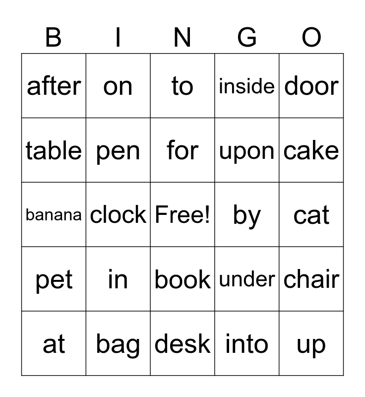 This bingo card has a free space and 24 words: in, bag, for, at, door, after, table, on, by, book, upon, banana, under, chair, pen, into, cat, to, cake, clock, up, pet, inside and desk.