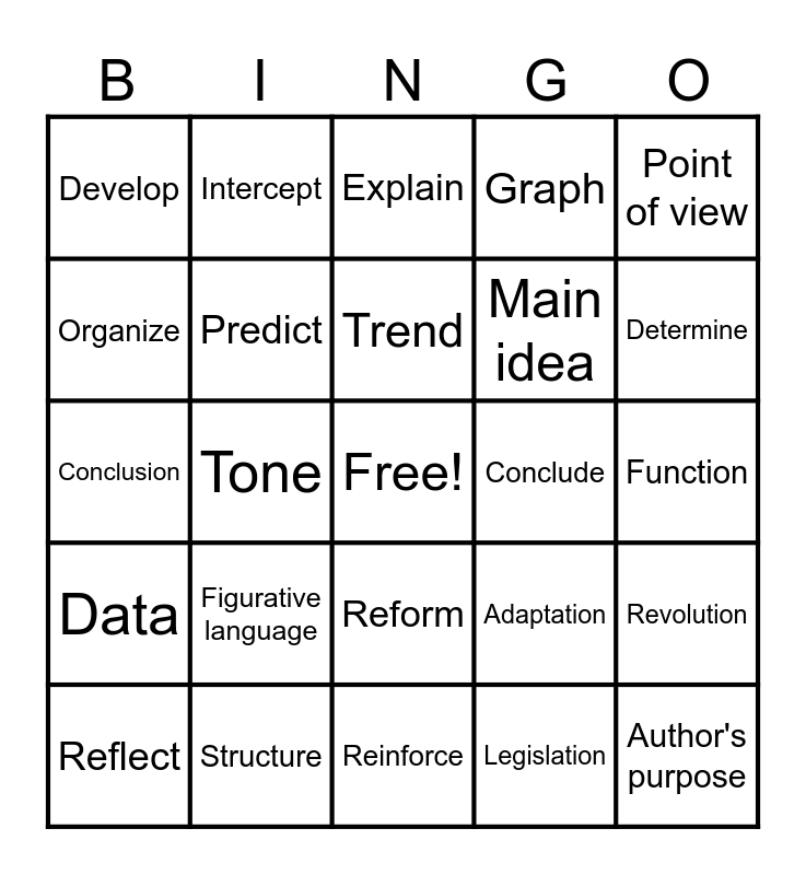 This bingo card has a free space and 82 words: Analyze, Evaluate, Explain, Describe, Support, Summarize, Compare, Contrast, Identify, Infer, interpret, Demonstrate, Predict, Conclude, Suggest, Develop, Reflect, Organize, Classify, Distinguish, Revise, Main idea, Author's purpose, Point of view, Tone, Mood, Text structure, Context clues, Theme, Dialogue, Figurative language, Transition, Conclusion, Thesis, Counterargument, Reinforce, Solve, Simplify, Determine, Calculate, Estimate, Graph, Equation, Expression, Function, Intercept, Rate of change, Trend, Inequality, Model, System, Function, Structure, Cycle, Cause and effect, System, Process, Trait, Survive, Adaptation, Evidence, Hypothesis, Data, Observation, Experiment, Conclusion, Impact, Significance, Cause, Effect, Policy, Constitutional, Reform, Legislation, Opposition, Civil rights, Movement, Era, Expansion, Treaty, Revolution and Economic.