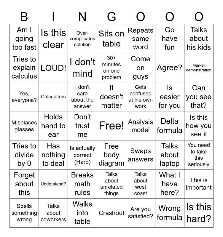 This bingo card has a free space and 48 words: Talks about west coast, Agree?, Crashout, Holds hand to ear, I don't care about the answer, Is this how you see it, Is this clear, Talks about coworkers, Go have fun, Free body diagram, Talks about his kids, Sits on table, Is easier for you, Gets confused at his own work, Forget about this, Delta formula, Tries to explain calculus, Marker demonstration, What I have here?, Repeats same word, Come on guys, Don't trust me, Am I going too fast, LOUD!, This is important, I don't mind, Can you see that?, Spells something wrong, It doesn't matter, Calculators, Wrong formula, Analysis model, You need to take this seriously, Understand?, Misplaces glasses, Swaps answers, Talks about laptop, Yes, everyone?, Is actually correct (Hard), Breaks math rules, Tries to divide by 0, Is this hard?, Over-complicates solution, Walks into table, 30+ minutes on one problem, Talks about unrelated things, Has nothing to deal and Are you satisfied?.
