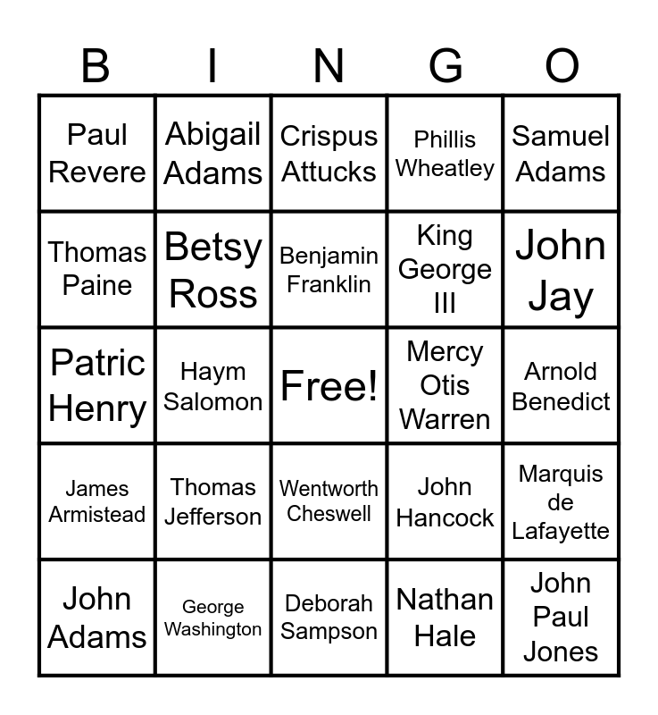 This bingo card has a free space and 24 words: Thomas Jefferson, George Washington, Benjamin Franklin, John Adams, Samuel Adams, Paul Revere, Thomas Paine, Abigail Adams, Mercy Otis Warren, Wentworth Cheswell, King George III, Patric Henry, John Hancock, Marquis de Lafayette, Betsy Ross, Nathan Hale, Arnold Benedict, Crispus Attucks, John Jay, Haym Salomon, John Paul Jones, James Armistead, Phillis Wheatley and Deborah Sampson.
