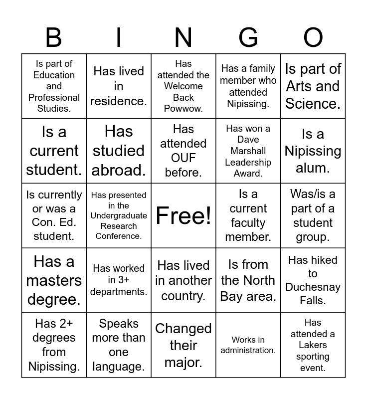 This bingo card has a free space and 24 words: Has worked in 3+ departments., Speaks more than one language., Has attended OUF before., Has 2+ degrees from Nipissing., Is part of Arts and Science., Is part of Education and Professional Studies., Is a current student., Has lived in residence., Is a current faculty member., Has lived in another country., Has won a Dave Marshall Leadership Award., Is currently or was a Con. Ed. student., Is from the North Bay area., Has hiked to Duchesnay Falls., Has studied abroad., Works in administration., Was/is a part of a student group., Has attended the Welcome Back Powwow., Is a Nipissing alum., Has presented in the Undergraduate Research Conference., Has attended a Lakers sporting event., Has a masters degree., Has a family member who attended Nipissing. and Changed their major..