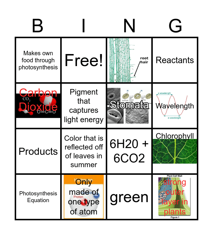 This bingo card has 19 images and 28 words: Chloroplast, Chlorophyll, Light Energy, strong outer layer in plants, Stomata, Carbon Dioxide, Oxygen, Free!, Wavelength, Heterotroph, Only made of one type of atom, Organism, 6H20 + 6CO2 + energy --> C6H12O6 + 6O2, 6H20 + 6CO2, Glucose+Oxygen, chlorophyll, autotroph, sun/light, green, chloroplast, Photosynthesis Equation, Reactants, Products, Pigment that captures light energy, Makes own food through photosynthesis, organelle where photosynthesis is done, Energy source to create products in photosynthesis and Color that is reflected off of leaves in summer.