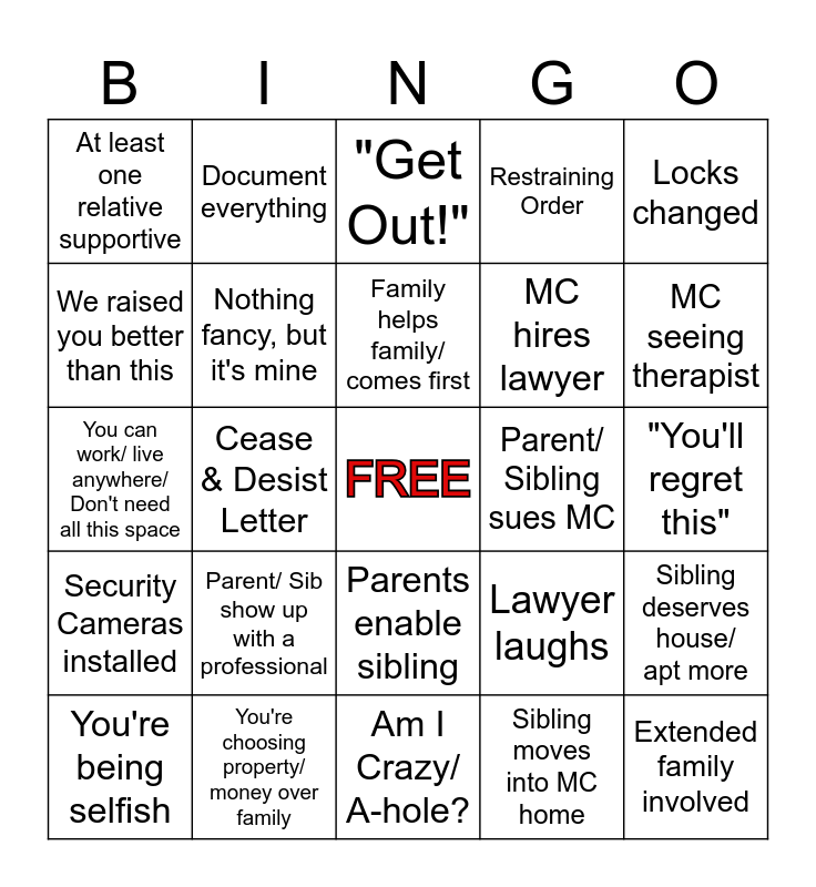This bingo card has a free space and 39 words: James/ Michael, Jennifer/ Patricia, Phone blows up (calls/ texts), Nothing fancy, but it's mine, You're being selfish, Parents enable sibling, Family helps family/ comes first, Spare/ Emergency Key used, Locks changed, Security Cameras installed, Cease & Desist Letter, Restraining Order, Extended family involved, "You'll regret this", Parent/ Sibling sues MC, Parent/ Sib show up with a professional, MC calls police on Parent/ Sibling, At least one relative supportive, MC sues Parent/ Sibling, Lawyer laughs, We raised you better than this, Am I Crazy/ A-hole?, MC hires lawyer, MC seeing therapist, "Golden Child", You're tearing the family apart, MC cut from family/ inheritance, Family dinner/ meeting => Ambush!, Parent/ Sib shows up at/ contacts work, Document everything, Eviction Notice, MC painted as mentally unstable, "Get Out!", You're choosing property/ money over family, Sibling moves into MC home, MC jealous of Sibling, Sibling deserves house/ apt more, You can work/ live anywhere/ Don't need all this space and MC ends up moving/ selling.