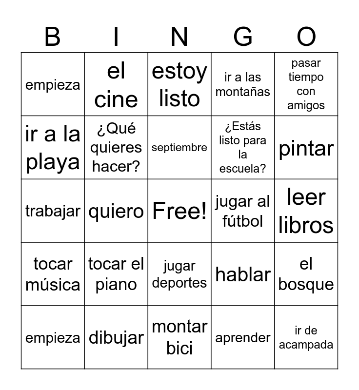 This bingo card has a free space and 29 words: empieza, acaba, quiero, tengo ganas de, empieza, estoy listo, ¿Qué quieres hacer?, tocar el piano, jugar al fútbol, dibujar, leer libros, ir de acampada, montar bici, aprender, pintar, reír, jugar deportes, tocar música, pasar tiempo con amigos, trabajar, hablar, ver películas, ¿Estás listo para la escuela?, ir a la playa, ir a las montañas, el cine, el bosque, septiembre and octubre.