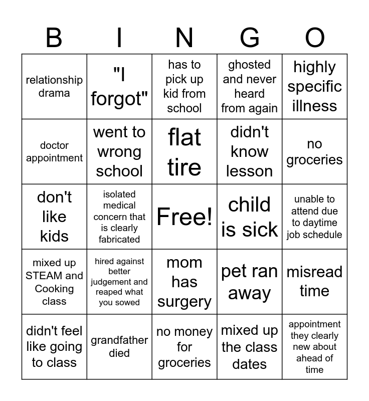This bingo card has a free space and 24 words: hired against better judgement and reaped what you sowed, grandfather died, flat tire, didn't feel like going to class, highly specific illness, relationship drama, doctor appointment, "I forgot", child is sick, mom has surgery, didn't know lesson, don't like kids, pet ran away, misread time, went to wrong school, mixed up the class dates, unable to attend due to daytime job schedule, has to pick up kid from school, no groceries, isolated medical concern that is clearly fabricated, appointment they clearly new about ahead of time, mixed up STEAM and Cooking class, ghosted and never heard from again and no money for groceries.