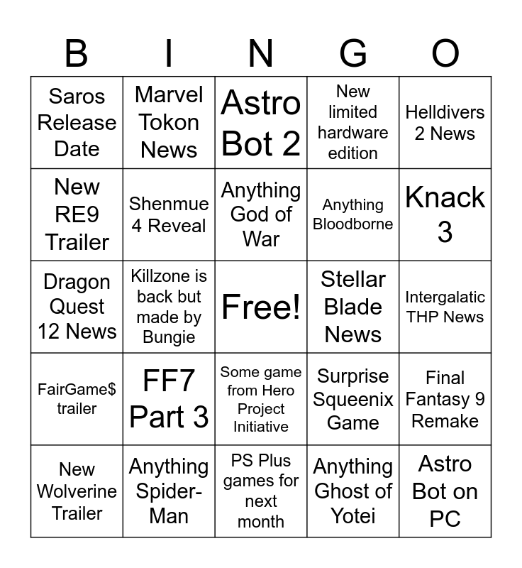 This bingo card has a free space and 24 words: FF7 Part 3, Anything Spider-Man, Anything God of War, New Wolverine Trailer, Helldivers 2 News, Saros Release Date, New RE9 Trailer, Marvel Tokon News, Stellar Blade News, Some game from Hero Project Initiative, Anything Bloodborne, Dragon Quest 12 News, Surprise Squeenix Game, Final Fantasy 9 Remake, Shenmue 4 Reveal, Anything Ghost of Yotei, Intergalatic THP News, Astro Bot 2, Knack 3, Killzone is back but made by Bungie, Astro Bot on PC, FairGame$ trailer, New limited hardware edition and PS Plus games for next month.