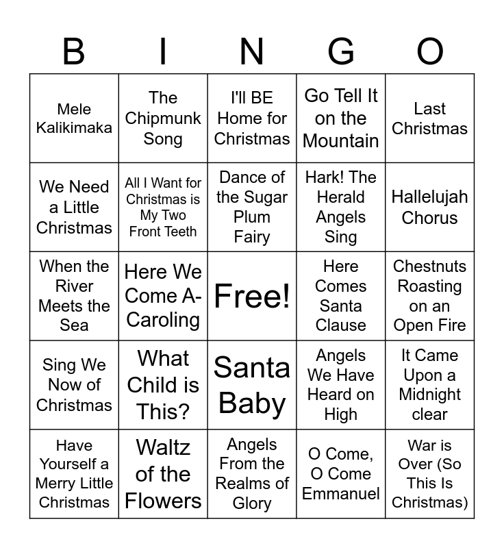 This bingo card has a free space and 103 words: It's Beginning to Look a Lot Like Christmas, All I want for Christmas is You, Last Christmas, Jingle Bell Rock, Jingle Bells, Holly Jolly Christmas, It's the Most Wonderful Time of the Year, Sleigh Ride, Deck the Halls, Run Rudolph Run, Grandma Got Run Over By a Reindeer, Winter Wonderland, This Christmas, I Saw Mommy Kissing Santa Clause, So You Hear What I Hear?, Joy to the World, I'll BE Home for Christmas, The Little Drummer Boy, You're a Mean One Mr. Grinch, That's Christmas to Me, Blue Christmas, Believe, Marshmallow World, Coventry Carol, Carol of the Bells, What Child is This?, Hallelujah Chorus, Go Tell It on the Mountain, I Heard the Bells On Christmas Day, Light Of Christmas, Angels We Have Heard on High, O Come, O Come Emmanuel, O Little Town of Bethlehem, Come Thou Long Expected Jesus, O Christmas Tree, We Three Kings, Infant Holy, Infant Lowly, Waltz of the Snowflakes, Dance of the Sugar Plum Fairy, Waltz of the Flowers, Magnificat, Sing We Now of Christmas, Holly Jolly Christmas, We Need a Little Christmas, Mary, Did You Know?, Mele Kalikimaka, While By Our Sleeping Flocks We Lay, War is Over (So This Is Christmas), Wonderful Christmas Time, This Christmas, Little Saint Nick, My Favorite Things, Happy Holiday, I Want a Hippopotamus for Christmas, Christmas Canon, Christmas Time is Here, Caroling, Caroling, The Christmas Waltz, Home for the Holidays, Santa Baby, Chestnuts Roasting on an Open Fire, Silver and Gold, Please Come Home for Christmas, Up On The Housetop, All Is Well, Gloria, Here With Us, The Chipmunk Song, When the River Meets the Sea, Here We Come A-Caroling, Angels From the Realms of Glory, Ding Dong Merrily on High, Good King Wencelas, Good Christian Men Rejoice, In The Bleak Midwinter, Sussex Carol, We Wish You a Merry Christmas, Have Yourself a Merry Little Christmas, The First Noel, Silent Night, Oh Holy Night!, Oh Come All Ye Faithful, All I Want for Christmas is My Two Front Teeth, Is That You Santa Clause?, Here Comes Santa Clause, I Saw Three Ships, Silver Bells, Away In a Manger, Frosty the Snowman, Rudolph the Red-Nosed Reindeer, God Rest Ye Merry Gentlemen, Feliz Navidad, It Came Upon a Midnight clear, I'm Dreaming of a White Christmas, Baby, It's Cold Outside, The Twelve Days of Christmas, Hark! The Herald Angels Sing, Have Yourself a Merry Little Christmas, Let It Snow! Let It Snow! Let It Snow!, Underneath the Tree, Santa Tell Me, Mistletoe and The Man with the Bag.