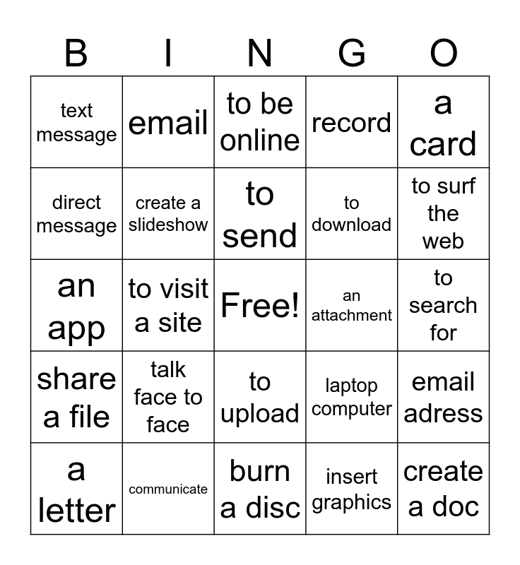 This bingo card has a free space and 24 words: talk face to face, communicate, to send, a letter, a card, text message, direct message, email, an attachment, to upload, to download, an app, laptop computer, email adress, create a slideshow, insert graphics, to search for, to be online, to surf the web, to visit a site, create a doc, share a file, record and burn a disc.