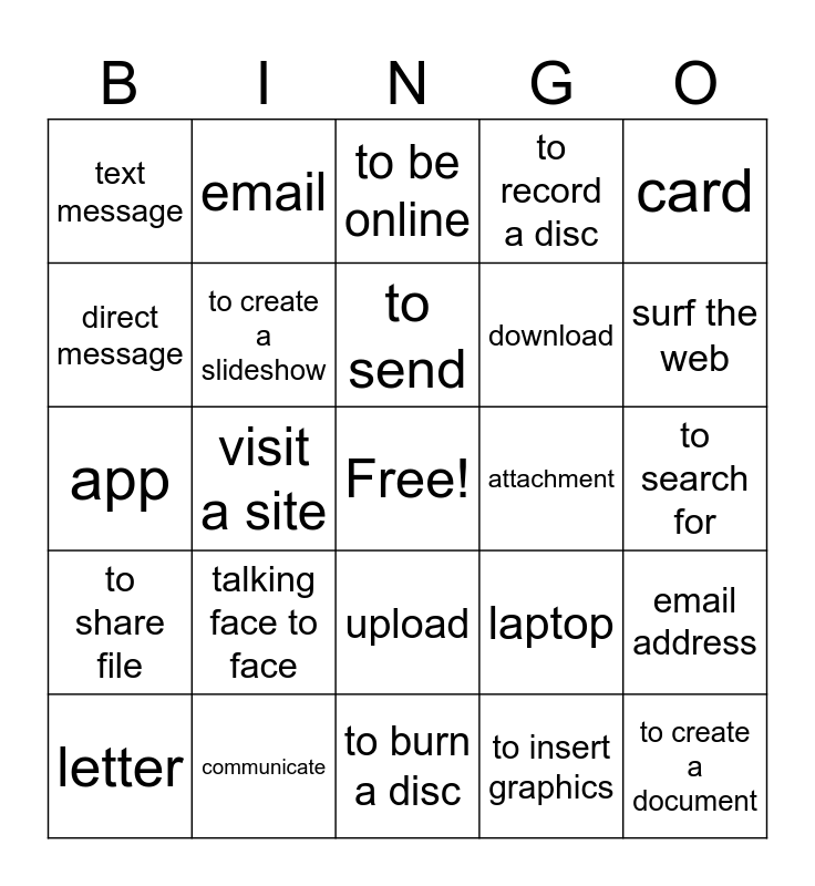 This bingo card has a free space and 24 words: talking face to face, communicate, to send, letter, card, text message, direct message, email, attachment, upload, download, app, laptop, email address, to create a slideshow, to insert graphics, to search for, to be online, surf the web, visit a site, to create a document, to share file, to record a disc and to burn a disc.
