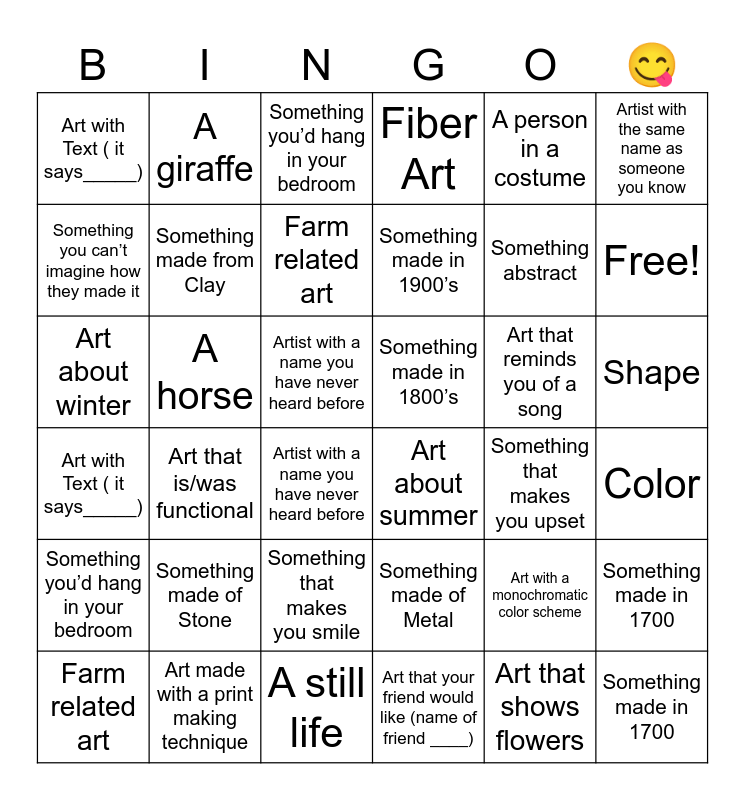 This bingo card has 83 words: A still life, Something abstract, Something you’d hang in your bedroom, Something that makes you smile, Something that makes you upset, Something that makes you curious, Something made in 1900’s, Something made in 1800’s, Something made in 1700, Art that your friend would like (name of friend ____), A portrait, Has a lot of texture, Something you can’t imagine how they made it, A horse, A giraffe, Art with Text ( it says_____), Artist with a name you have never heard before, Artist with the same name as someone you know, Fiber Art, Art made with a print making technique, Art that shows flowers, Farm related art, Art about winter, Art about summer, Free!, Something that is unexpected to find in a museum, Art that is/was functional, Art of somewhere you'd like to go on a vacation to, Art with a monochromatic color scheme, Black and white art, Art that reminds you of a song, Something you recognize, A still life, Something abstract, Something you’d hang in your bedroom, Something that makes you smile, Something that makes you upset, Something that makes you curious, Something made in 1900’s, Something made in 1800’s, Something made in 1700, Art that your friend would like (name of friend ____), A portrait, Has a lot of texture, Something you can’t imagine how they made it, A horse, A giraffe, An Elephant, Someone wearing a hat., An outfit you would wear, Art with Text ( it says_____), Fiber Art, Artist with a name you have never heard before, Artist with the same name as someone you know, Art made with a print making technique, Art that shows flowers, Farm related art, Art about winter, Art about summer, Art about spring, Art about Fall, A Dog, A Cat, A person in a costume, Something that is unexpected to find in a museum, Art that is/was functional, Art of somewhere you'd like to go on a vacation to, Art with a monochromatic color scheme, Black and white art, Art that reminds you of a song, Something you recognize, Line, Space, Shape, Color, Value, Pattern, Something made from Clay, Something made of Metal, Something made of Stone, Something made of Wood, Something made of Paper and Something mini.