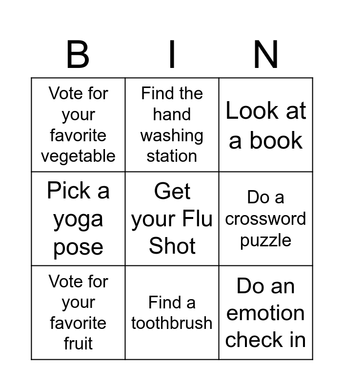 This bingo card has a free space and 8 words: Do a crossword puzzle, Look at a book, Find the hand washing station, Vote for your favorite fruit, Vote for your favorite vegetable, Do an emotion check in, Pick a yoga pose and Find a toothbrush.