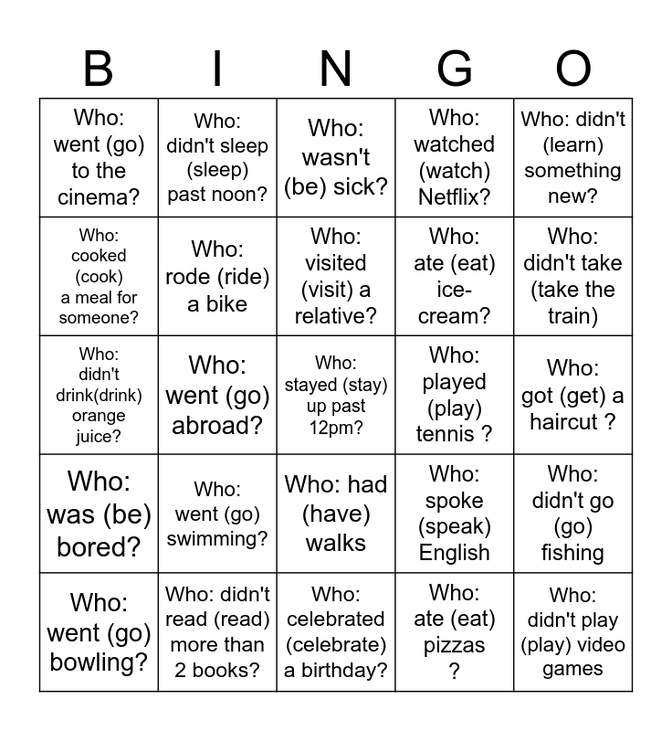 This bingo card has a free space and 24 words: Who: went (go) swimming?, Who: didn't read (read) more than 2 books?, Who: visited (visit) a relative?, Who: went (go) bowling?, Who: didn't (learn) something new?, Who: went (go) to the cinema?, Who: cooked (cook) a meal for someone?, Who: didn't sleep (sleep) past noon?, Who: played (play) tennis ?, Who: had (have) walks, Who: ate (eat) ice-cream?, Who: didn't drink(drink) orange juice?, Who: spoke (speak) English, Who: didn't go (go) fishing, Who: rode (ride) a bike, Who: ate (eat) pizzas ?, Who: got (get) a haircut ?, Who: wasn't (be) sick?, Who: didn't take (take the train), Who: went (go) abroad?, Who: didn't play (play) video games, Who: was (be) bored?, Who: watched (watch) Netflix? and Who: celebrated (celebrate) a birthday?.