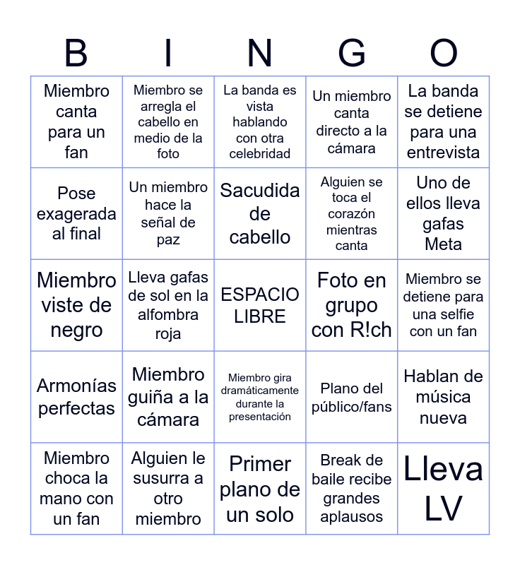 This bingo card has a free space and 24 words: Miembro guiña a la cámara, Alguien le susurra a otro miembro, Sacudida de cabello, Miembro choca la mano con un fan, La banda se detiene para una entrevista, Miembro canta para un fan, Pose exagerada al final, Miembro se arregla el cabello en medio de la foto, Foto en grupo con R!ch, Miembro gira dramáticamente durante la presentación, Alguien se toca el corazón mientras canta, Miembro viste de negro, Plano del público/fans, Hablan de música nueva, Un miembro hace la señal de paz, Break de baile recibe grandes aplausos, Miembro se detiene para una selfie con un fan, La banda es vista hablando con otra celebridad, Uno de ellos lleva gafas Meta, Lleva gafas de sol en la alfombra roja, Lleva LV, Armonías perfectas, Un miembro canta directo a la cámara and Primer plano de un solo.