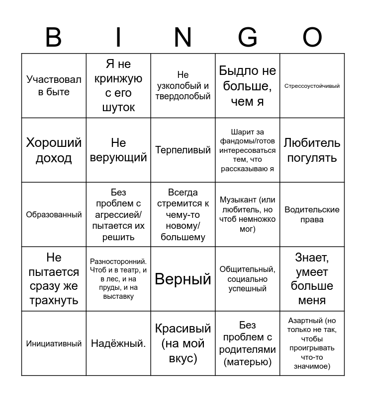 This bingo card has 25 words: Разносторонний. Чтоб и в театр, и в лес, и на пруды, и на выставку, Красивый (на мой вкус), Терпеливый, Инициативный, Стрессоустойчивый, Участвовал в быте, Хороший доход, Я не кринжую с его шуток, Музыкант (или любитель, но чтоб немножко мог), Верный, Шарит за фандомы/готов интересоваться тем, что рассказываю я, Образованный, Общительный, социально успешный, Знает, умеет больше меня, Не верующий, Азартный (но только не так, чтобы проигрывать что-то значимое), Водительские права, Не узколобый и твердолобый, Любитель погулять, Без проблем с агрессией/пытается их решить, Всегда стремится к чему-то новому/большему, Надёжный., Не пытается сразу же трахнуть, Быдло не больше, чем я and Без проблем с родителями (матерью).