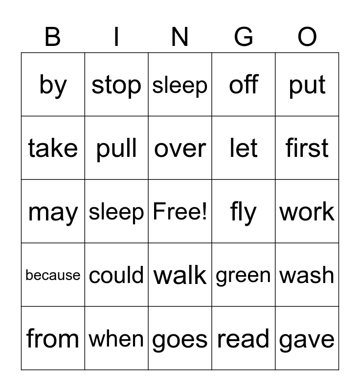 This bingo card has a free space and 24 words: could, when, over, from, put, by, take, stop, fly, walk, let, may, green, wash, pull, read, work, sleep, first, sleep, gave, because, off and goes.