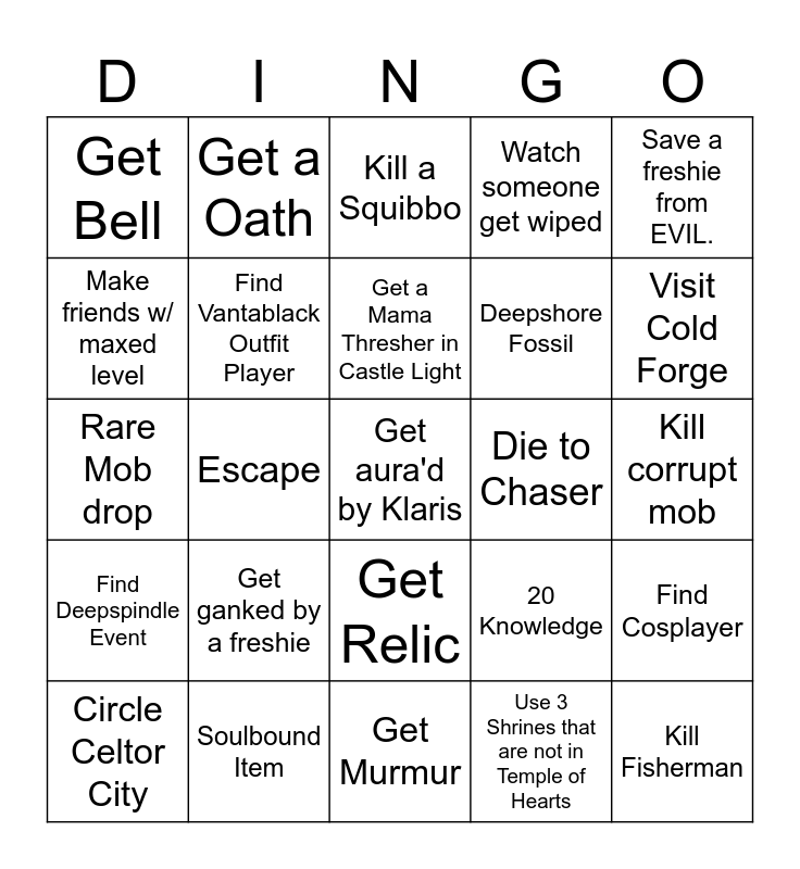 This bingo card has a free space and 24 words: Get ganked by a freshie, Soulbound Item, Get a Mama Thresher in Castle Light, Circle Celtor City, Save a freshie from EVIL., Get Bell, Make friends w/ maxed level, Get a Oath, Die to Chaser, Get Relic, Deepshore Fossil, Rare Mob drop, 20 Knowledge, Find Cosplayer, Find Vantablack Outfit Player, Use 3 Shrines that are not in Temple of Hearts, Kill corrupt mob, Kill a Squibbo, Visit Cold Forge, Escape, Kill Fisherman, Find Deepspindle Event, Watch someone get wiped and Get Murmur.