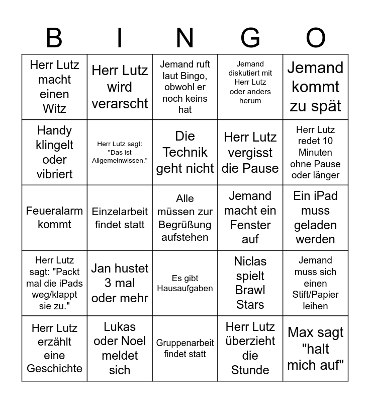 This bingo card has a free space and 24 words: Jan hustet 3 mal oder mehr, Lukas oder Noel meldet sich, Die Technik geht nicht, Herr Lutz erzählt eine Geschichte, Jemand kommt zu spät, Herr Lutz macht einen Witz, Handy klingelt oder vibriert, Herr Lutz wird verarscht, Jemand macht ein Fenster auf, Es gibt Hausaufgaben, Herr Lutz vergisst die Pause, Feueralarm kommt, Niclas spielt Brawl Stars, Jemand muss sich einen Stift/Papier leihen, Herr Lutz sagt: "Das ist Allgemeinwissen.", Herr Lutz überzieht die Stunde, Ein iPad muss geladen werden, Jemand ruft laut Bingo, obwohl er noch keins hat, Herr Lutz redet 10 Minuten ohne Pause oder länger, Einzelarbeit findet statt, Max sagt "halt mich auf", Herr Lutz sagt: "Packt mal die iPads weg/klappt sie zu.", Jemand diskutiert mit Herr Lutz oder anders herum and Gruppenarbeit findet statt.