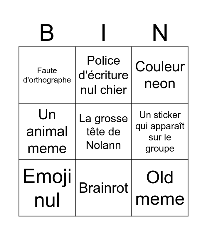 This bingo card has 9 words: Emoji nul, Couleur neon, Police d'écriture nul chier, Un animal meme, Faute d'orthographe, Un sticker qui apparaît sur le groupe, La grosse tête de Nolann, Old meme and Brainrot.