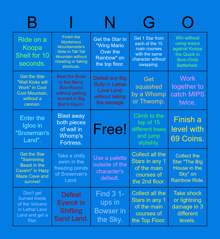 This bingo card has a free space and 104 words: Get the Star "Shoot to the Island in the Sky" w/o cannons., "Do 100 Long Jumps in Total", Win without using warps against Koopa the Quick in Bom-Omb Battlefield., Defeat ANY Bowser without getting burned., Get a 1-up from defeating a bunch of Monty Moles., Collect the Star "Stomp on the Thwomp" when the Hand is on "6" and survive., Collect the Star "Somewhere Over the Rainbow" and survive., Take the "shortcut" in the frosty slide., Get any star (and survive) in Jolly Roger Bay, Dire Dire Docks, or Wet-Dry World during a thunderstorm., Collect any star when the in-game timer hits 9PM-5AM., Die while in the castle., Participate in finding Tuxie and delivering her to their mother., Get the Star "Inside the Ancient Pyramid" starting from the bottom entrance., Clear "The Princess's Secret Slide" in under 20.5 seconds., Collect ANY Star (and survive) with your camera on "Player" mode without zooming out., Collect any Star (and survive) in "Rainbow Ride" without breaking your ankles (Fall damage), Get the Star in "Wing Mario Over the Rainbow" on the top floor., Get the Star "Vanish Cap Under the Moat" outside of the castle., Get the Star "Tower of the Wing Cap" by looking into the light inside the castle., Get the Star "Cavern of the Metal Cap" within a Hazy Maze of a Cave (and survive!), Get the Star "Snowman's Big Head" (and survive!), Defeat Wiggler in "Make Wiggler Squirm"!, Get the Star "Go to Town for Red Coins" in Wet-Dry World!, Defeat Mr. I in Big Boo's Haunt and successfully nab the star!, Succeed in keeping the 100 Coin Star in Wet-Dry World., Take a chilly swim in the freezing ponds of Snowman's Land., Work together to catch MIPS twice., Get 1 Star from each of the 15 main courses with the same character without swapping., Collect all the Stars in any 1 of the main courses of the 1st floor., Collect all the Stars in any 1 of the main courses of the Basement floor., Collect all the Stars in any 1 of the main courses of the 2nd floor., Collect all the Stars in any 1 of the main courses of the Top Floor., Collect any Star as a character OTHER than anyone from the Mario (or Yoshi) series., Get to Bowser in "Bowser in the Fire Sea" without taking damage., Defeat the Whomp King in Whomp's Fortress and take his Star!, In a single run of "Big Boo's Haunt", defeat 2 Big Boos., In "Watch for Rolling Rocks" avoid the rocks and get the star (and survive!), In Hazy Maze Cave, get Star #4 or #5 without Metal Cap (and survive!), Defeat any Big Bully in Lethal Lava Land without taking fire damage, Defeat Eyerok in Shifting Sand Land., Defeat King Bom-Omb without using a custom moveset character., Get the Star "Swimming Beast in the Cavern" in Hazy Maze Cave and survive!, Deliver the Uki-Uki (Monkey) in Tall Tall Mountain., Get the Star "Wall Kicks will Work" in Cool Cool Mountain, without a cannon., Finish a level where another player is present with you., Ride on a Koopa Shell for 10 seconds., Watch another player die in front of your eyes (Whether or not you were responsible), Take shock or lightning damage in 3 different levels., Starting from where the Mama Penguin is, make your way back to the start of Cool Cool Mountain WITHOUT cannons or warps., Defeat any boss without taking damage. (Must fight it without others helping), Get ANY 100 Coin Star without taking damage (and survive!), Get all 8 Red Coins in Dire Dire Docks without falling in the water before collecting them all once you grab the 1st., Fall out the waterfall and appear back outside the castle area., Get all 8 Red Coins in Tick Tock Clock while time is moving (Hand not on 12), Get the Hidden 1-up in Whomp's Fortress (Hint: Star 2-6), Ground Pound 3 Giant Goombas., Defeat the Piranha Plants on Tiny-Huge Island without falling into the water., Stand Tall On the Four Pillars in Shifting Sand Land and destroy the Pyramid Top without using Wing Cap., Do 30 Triple Jumps in Total., Use a palette outside of the character's default., Finish a level with 69 Coins., Finish a level while your power is in the red., Get the Star "Top of the Mountain" in Tiny-Huge Island without becoming Huge., Make 3 Snowman in total, fall over., Talk to every Toad in the castle at least once., Find and use the warp in Whomp's Fortress., Get attacked by the Condor in Shifting Sand Land, Finish the Mysterious Mountainside's Slide in Tall Tall Mountain without cheating or taking shortcuts., Enter the Igloo in "Snowman's Land"., Blast away both pieces of wall in Whomp's Fortress., Find 3 1-ups in Bowser in the Sky., Take a nap for 1 minute., Acquire any Star within 1:30 (and survive!), As a group, get 70 Stars., LUCKY YOU! EXTRA FREE SPACE!, Bonk into a wall 30 times in total., Collect all of the Blue Coins in a Blue Coin Button sequence., Don't get burned inside of the Volcano in Lethal Lava Land and get a Star., While in any stage with water, drown., Take the baby penguin from the start of CCM (or found in a level elsewhere) and get to the mama penguin without "taking shortcuts", Grab and toss 10 Chuckyas (The purple enemies that grab you), Get squished by a Tox Box in Shifting Sand Land., Beat the Boos in the Merry Boo-Round without getting burned in Big Boo's Haunt., In "Mario wings over the rainbow" clear the stage while using less than 3 wing cap pickups., Climb to the top of 15 different trees and jump stylishly., Get caught up in two different sand tornados in Shifting Sand Land., Get the Star on the Lonely Mushroom in Tall Tall Mountain (and survive!), Complete "Pyramid Puzzle" in Shifting Sand Land (Can be done with help), Beat the Penguin on the Frosty Slide., If all 120 Stars are found, mark this and any one other space of your choosing for free!, Destroy 3 Pokeys in Shifting Sand Land, Don't complain about your situation and escape a level successfully with any Star you collect., Collect 5 different Stars without Long Jumping., Collect the Star "The Big House in the Sky" on Rainbow Ride., Work together 