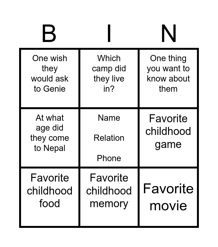 This bingo card has a free space and 8 words: At what age did they come to Nepal, Which camp did they live in?, Favorite childhood game, Favorite childhood food, One thing you want to know about them, One wish they would ask to Genie, Favorite childhood memory and Favorite movie.
