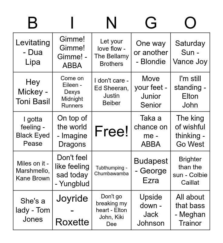 This bingo card has a free space and 59 words: Stuck in the middle with you - Stealers Wheel, Joyride - Roxette, Freedom! '90 - George Michael, Miles on it - Marshmello, Kane Brown, Upside down - Jack Johnson, A bar song (tipsy) - Shaboozey, Come on Eileen - Dexys Midnight Runners, Shivers - Ed Sheeran, Move your feet - Junior Senior, Don't stop me now - Queen, One way or another - Blondie, Dynamite - BTS, Hey Mickey - Toni Basil, Rain on me - Lady Gaga, Ariana Grande, Despacito - Luis Fonsi, Daddy Yankee, Justin Beiber, Levitating - Dua Lipa, All about that bass - Meghan Trainor, Saturday Sun - Vance Joy, Blister in the sun - Violent Femmes, I don't care - Ed Sheeran, Justin Beiber, Taka a chance on me - ABBA, Let your love flow - The Bellamy Brothers, She's a lady - Tom Jones, Brighter than the sun - Colbie Caillat, My life - Billy Joel, You can't hurry love - Phil Collins, Got my mind set on you - Geroge Harrison, Mustang Sally - The Commitments, Andrew Song, I'm still standing - Elton John, Cotton candy - Yunglblud, Unwritten - Natasha Bedingfield, Too sweet - Hozier, Heat waves - Glass Animals, Carry you home - Alex Warren, Gimme! Gimme! Gimme! - ABBA, Alright - Supergrass, Wish I knew you - The Revivalists, On top of the world - Imagine Dragons, Ob-la-di, Ob-la-da - The Beatles, I gotta feeling - Black Eyed Pease, These words - Natasha Bedingfield, Don't feel like feeling sad today - Yungblud, The king of wishful thinking - Go West, Suddenly I see - KT Tunstall, Dancing in the moonlight - Toplander, I wanna dance with somebody - Whitney Houston, I'm gonna be (500 miles) - The Proclaimers, Send me on my way - Rusted Root, Tubthumping - Chumbawamba, Don't go breaking my heart - Elton John, Kiki Dee, Wake me up before you go-go - Wham!, Walking on sunshine - Katrina & The Waves, Don't you forget about me - Simple Minds, Kung Fu fighting - Carl Douglas, Come and get your love - Redbone, Budapest - George Ezra, Raise your glass - Pink, Pocketful of sunshine - Natasha Bedingfield and The look - Roxette.