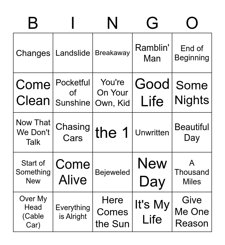 This bingo card has a free space and 45 words: I Can See Clearly Now, Give Me One Reason, Move Along, Over My Head (Cable Car), Put Your Records On, It's My Life, Breakaway, Ride, End of Beginning, Everything is Alright, Ramblin' Man, Unwritten, Bejeweled, Come Alive, Night Changes, Here Comes the Sun, This Feeling, Now That We Don't Talk, Move on Up, Some Nights, Landslide, Stronger, Let It Go, Changes, A Change Is Gonna Come, Beautiful Day, I Will Survive, Don't Look Back, New Day, Start of Something New, All the Stars (With SZA), A Thousand Miles, You Learn, Bye Bye Bye, Wrecking Ball, Chasing Cars, Live Your Life, When I Grow Up, Vienna, You're On Your Own, Kid, Come Clean, Good Life, I'm Like a Bird, Pocketful of Sunshine and Send Me On My Way.