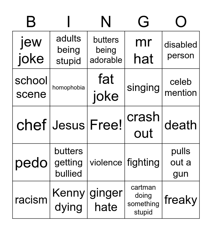 This bingo card has a free space and 24 words: butters getting bullied, Kenny dying, fat joke, racism, disabled person, jew joke, school scene, adults being stupid, crash out, violence, singing, chef, fighting, pulls out a gun, homophobia, cartman doing something stupid, death, butters being adorable, celeb mention, Jesus, freaky, pedo, mr hat and ginger hate.