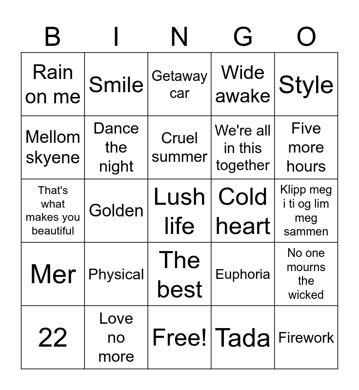 This bingo card has 29 words: 22, 5 fine frøkner, Golden, Firework, Rain on me, Getaway car, Dance the night, Physical, Cold heart, Love no more, Klipp meg i ti og lim meg sammen, Lush life, Free!, Tada, Five more hours, I knew you were trouble, The best, Mer, Style, That's what makes you beautiful, Euphoria, Cha cha cha, We're all in this together, Mellom skyene, Wide awake, Smile, No one mourns the wicked, Cruel summer and Don't stop me now.
