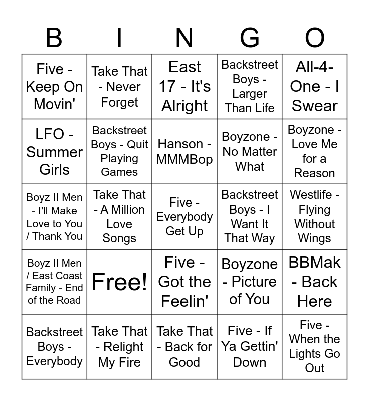 This bingo card has 25 words: Free!, Take That - Back for Good, Hanson - MMMBop, Backstreet Boys - Everybody, All-4-One - I Swear, Five - Keep On Movin', LFO - Summer Girls, Take That - Never Forget, Backstreet Boys - I Want It That Way, Five - Got the Feelin', Boyzone - No Matter What, Boyz II Men - I'll Make Love to You / Thank You, Boyzone - Picture of You, BBMak - Back Here, Backstreet Boys - Quit Playing Games, Five - When the Lights Go Out, Westlife - Flying Without Wings, East 17 - It's Alright, Boyzone - Love Me for a Reason, Take That - A Million Love Songs, Five - Everybody Get Up, Take That - Relight My Fire, Boyz II Men / East Coast Family - End of the Road, Backstreet Boys - Larger Than Life and Five - If Ya Gettin' Down.