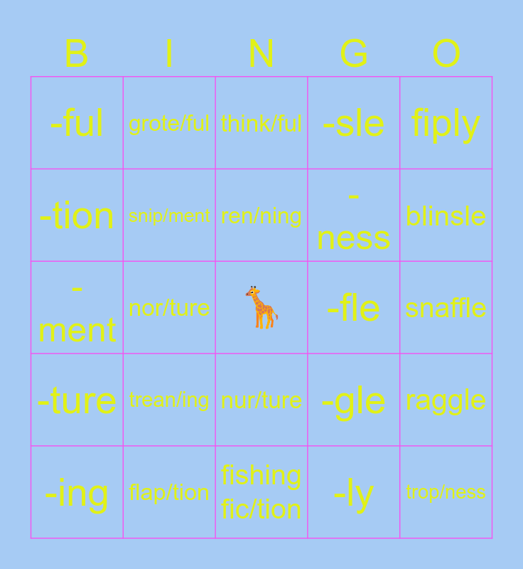 This bingo card has a free space and 24 words: -ing, trean/ing, ren/ning, -ly, fiply, -ful, grote/ful, think/ful, -fle, snaffle, -ment, snip/ment, -gle, raggle, -tion, flap/tion, fishing fic/tion, -sle, blinsle, -ture, nor/ture, nur/ture, -ness and trop/ness.