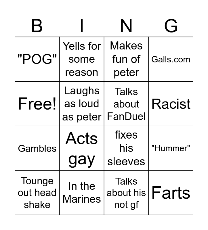 This bingo card has 16 words: In the Marines, "Hummer", Makes fun of peter, "POG", Gambles, Yells for some reason, fixes his sleeves, Talks about his not gf, Free!, Laughs as loud as peter, Tounge out head shake, Galls.com, Acts gay, Racist, Talks about FanDuel and Farts.