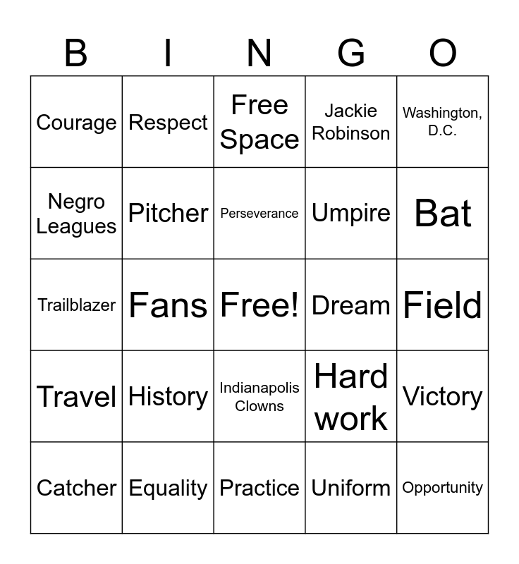 This bingo card has a free space and 35 words: Mamie Johnson, Peanut, Curveball, Pitcher, Indianapolis Clowns, Jackie Robinson, Negro Leagues, Baseball, Perseverance, Determination, Trailblazer, Washington, D.C., Barrier, Teamwork, Courage, Dream, Uniform, Fans, Travel, Opportunity, Hard work, Catcher, Victory, Equality, Free Space, Bat, Ball, Glove, Umpire, Field, Dugout, Practice, History, Respect and Game.