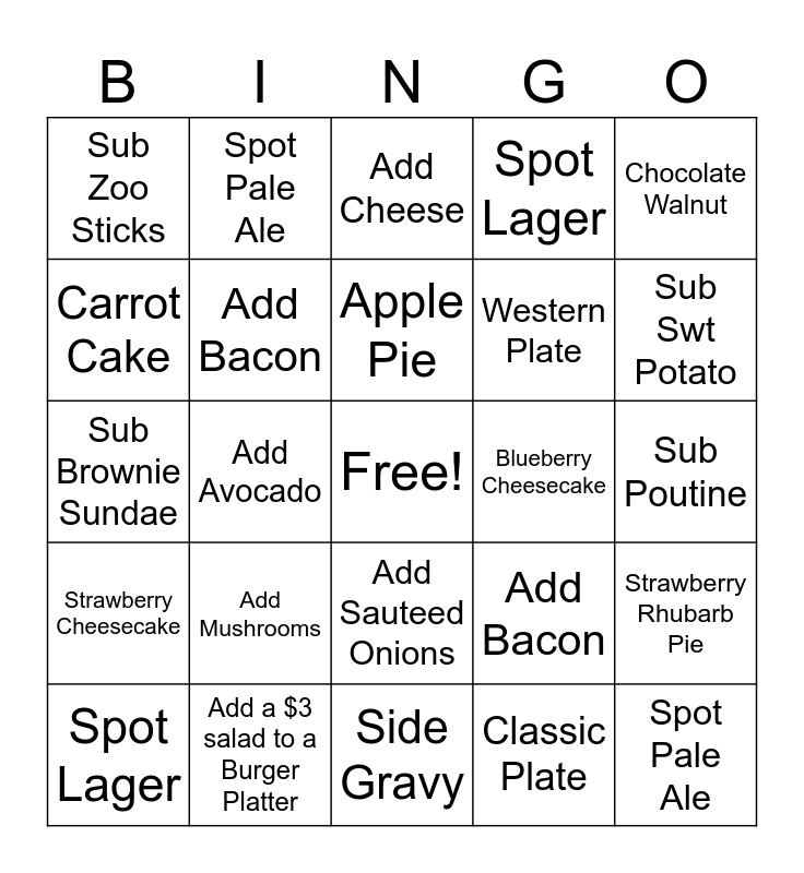 This bingo card has a free space and 24 words: Spot Lager, Add Mushrooms, Apple Pie, Classic Plate, Chocolate Walnut, Sub Zoo Sticks, Spot Pale Ale, Add Cheese, Blueberry Cheesecake, Sub Poutine, Sub Brownie Sundae, Add Bacon, Add Bacon, Strawberry Rhubarb Pie, Carrot Cake, Add a $3 salad to a Burger Platter, Side Gravy, Spot Lager, Sub Swt Potato, Strawberry Cheesecake, Add Avocado, Add Sauteed Onions, Western Plate and Spot Pale Ale.