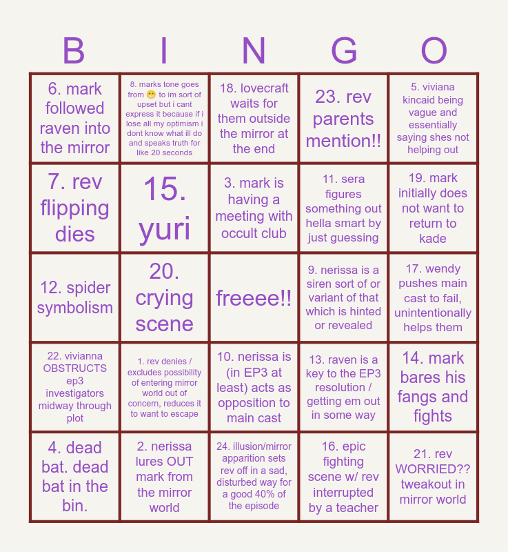 This bingo card has a free space and 24 words: 1. rev denies / excludes possibility of entering mirror world out of concern, reduces it to want to escape, 2. nerissa lures OUT mark from the mirror world, 3. mark is having a meeting with occult club, 4. dead bat. dead bat in the bin., 5. viviana kincaid being vague and essentially saying shes not helping out, 6. mark followed raven into the mirror, 7. rev flipping dies, 8. marks tone goes from 😁 to im sort of upset but i cant express it because if i lose all my optimism i dont know what ill do and speaks truth for like 20 seconds, 9. nerissa is a siren sort of or variant of that which is hinted or revealed, 10. nerissa is (in EP3 at least) acts as opposition to main cast, 11. sera figures something out hella smart by just guessing, 12. spider symbolism, 13. raven is a key to the EP3 resolution / getting em out in some way, 14. mark bares his fangs and fights, 15. yuri, 16. epic fighting scene w/ rev interrupted by a teacher, 17. wendy pushes main cast to fail, unintentionally helps them, 18. lovecraft waits for them outside the mirror at the end, 19. mark initially does not want to return to kade, 20. crying scene, 21. rev WORRIED?? tweakout in mirror world, 22. vivianna OBSTRUCTS ep3 investigators midway through plot, 23. rev parents mention!! and 24. illusion/mirror apparition sets rev off in a sad, disturbed way for a good 40% of the episode.