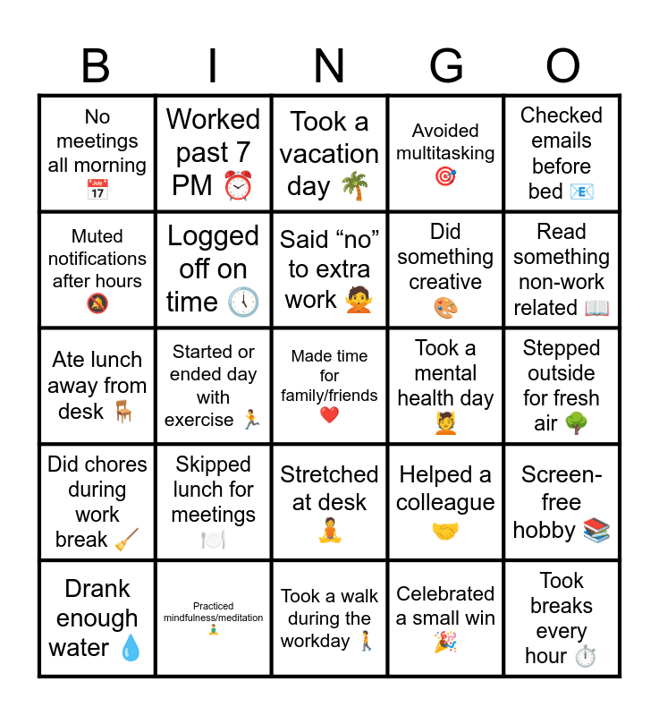 This bingo card has 25 words: Skipped lunch for meetings ๐ฝ๏ธ, Took a walk during the workday ๐ถ, Said โnoโ to extra work ๐ , Drank enough water ๐ง, Checked emails before bed ๐ง, No meetings all morning ๐ , Muted notifications after hours ๐, Worked past 7 PM โฐ, Took a mental health day ๐, Stretched at desk ๐ง, Did something creative ๐จ, Ate lunch away from desk ๐ช, Helped a colleague ๐ค, Screen-free hobby ๐, Logged off on time ๐, Took breaks every hour โฑ๏ธ, Stepped outside for fresh air ๐ณ, Took a vacation day ๐ด, Read something non-work related ๐, Started or ended day with exercise ๐, Made time for family/friends โค๏ธ, Practiced mindfulness/meditation ๐งโโ๏ธ, Did chores during work break ๐งน, Avoided multitasking ๐ฏ and Celebrated a small win ๐.