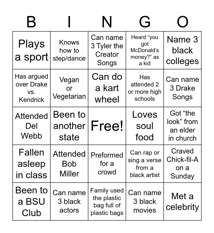 This bingo card has a free space and 24 words: Been to a BSU Club, Attended Bob Miller, Can do a kart wheel, Can name 3 black movies, Name 3 black colleges, Plays a sport, Knows how to step/dance, Can name 3 Tyler the Creator Songs, Loves soul food, Got “the look” from an elder in church, Attended Del Webb, Vegan or Vegetarian, Can rap or sing a verse from a black artist, Craved Chick-fil-A on a Sunday, Has argued over Drake vs. Kendrick, Can name 3 black actors, Family used the plastic bag full of plastic bags, Heard “you got McDonald’s money?” as a kid, Can name 3 Drake Songs, Fallen asleep in class, Been to another state, Preformed for a crowd, Has attended 2 or more high schools and Met a celebrity.