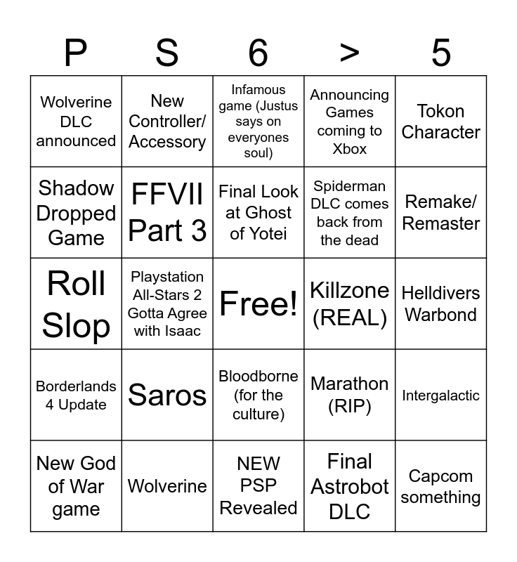 This bingo card has a free space and 24 words: Saros, Wolverine, Final Look at Ghost of Yotei, New God of War game, Tokon Character, Wolverine DLC announced, Shadow Dropped Game, New Controller/ Accessory, Killzone (REAL), Bloodborne (for the culture), Spiderman DLC comes back from the dead, Roll Slop, Marathon (RIP), Intergalactic, FFVII Part 3, Final Astrobot DLC, Helldivers Warbond, Infamous game (Justus says on everyones soul), Remake/ Remaster, Playstation All-Stars 2 Gotta Agree with Isaac, Capcom something, Borderlands 4 Update, Announcing Games coming to Xbox and NEW PSP Revealed.