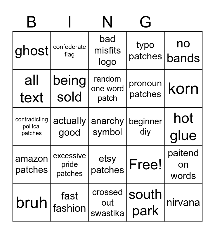 This bingo card has 25 words: excessive pride patches, crossed out swastika, random one word patch, bruh, no bands, ghost, all text, confederate flag, beginner diy, etsy patches, pronoun patches, contradicting politcal patches, Free!, paitend on words, being sold, nirvana, hot glue, bad misfits logo, korn, actually good, anarchy symbol, fast fashion, amazon patches, typo patches and south park.